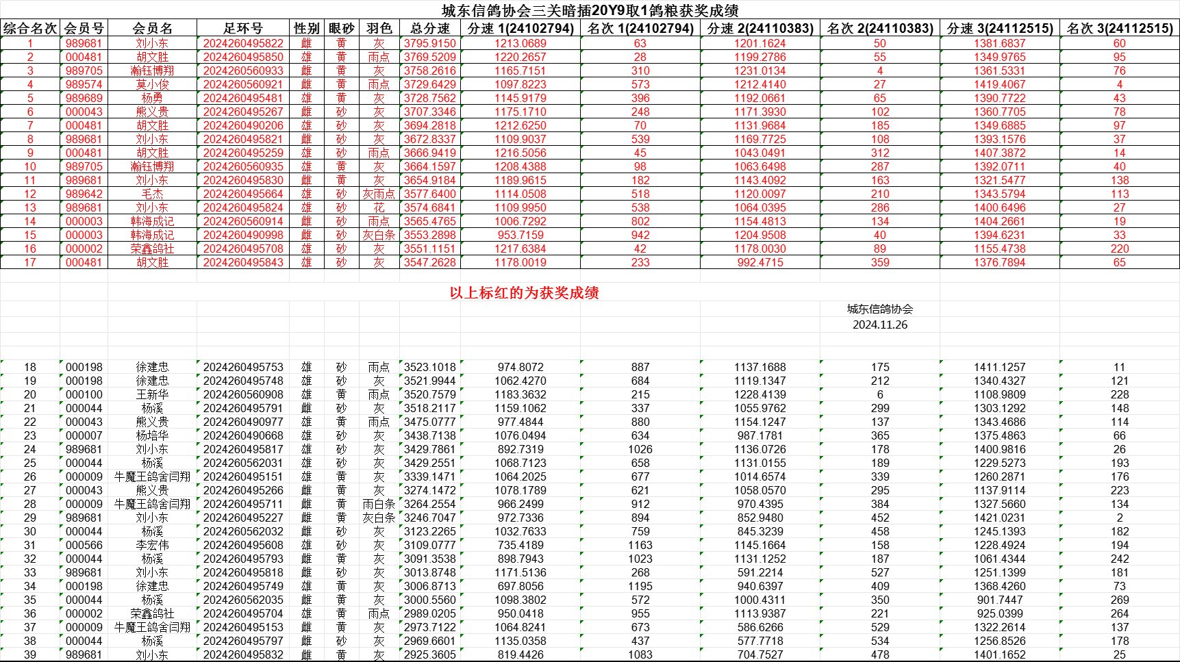 城东信鸽协会三关暗插20Y9取1鸽粮获奖成绩