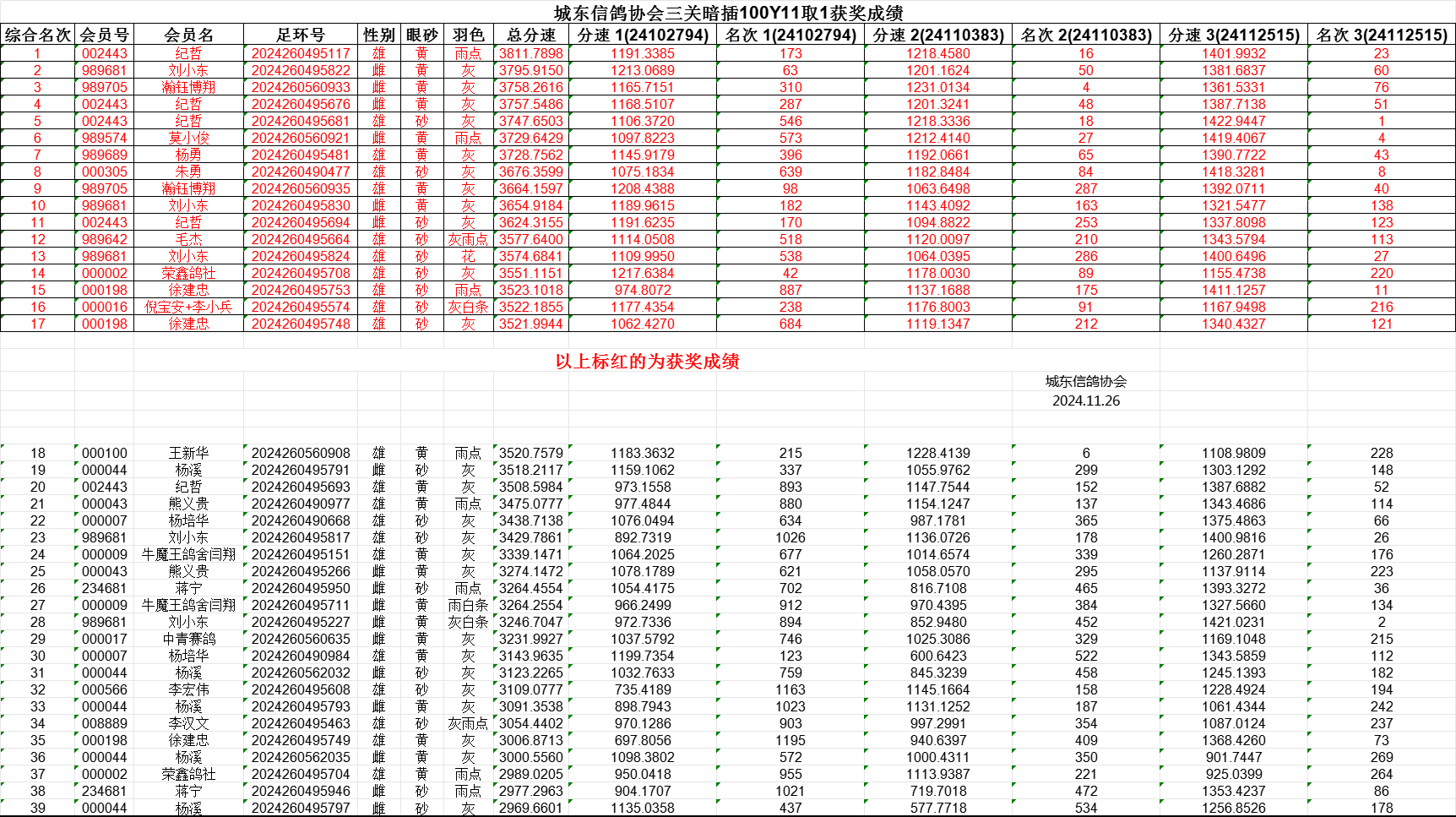 城东信鸽协会三关暗插100Y11取1获奖成绩