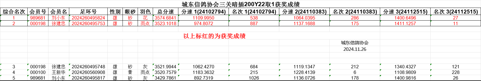 城东信鸽协会三关暗插200Y22取1获奖成绩