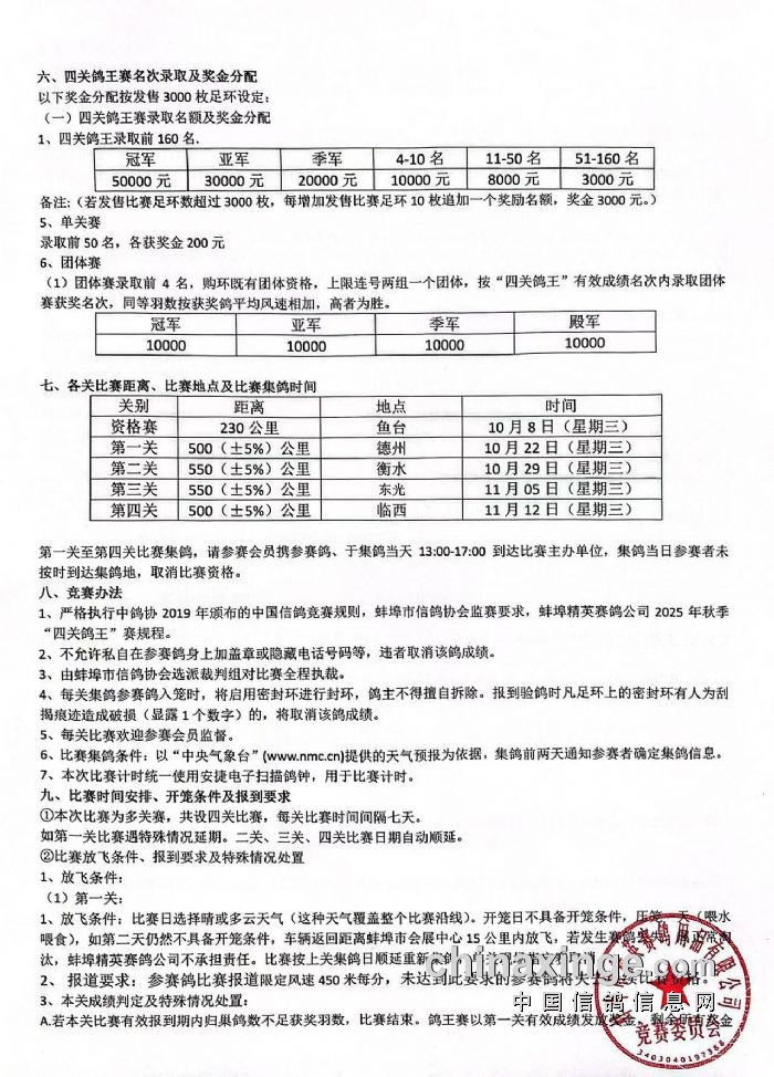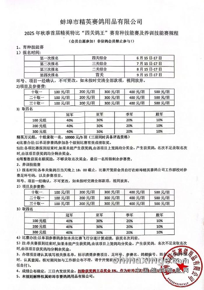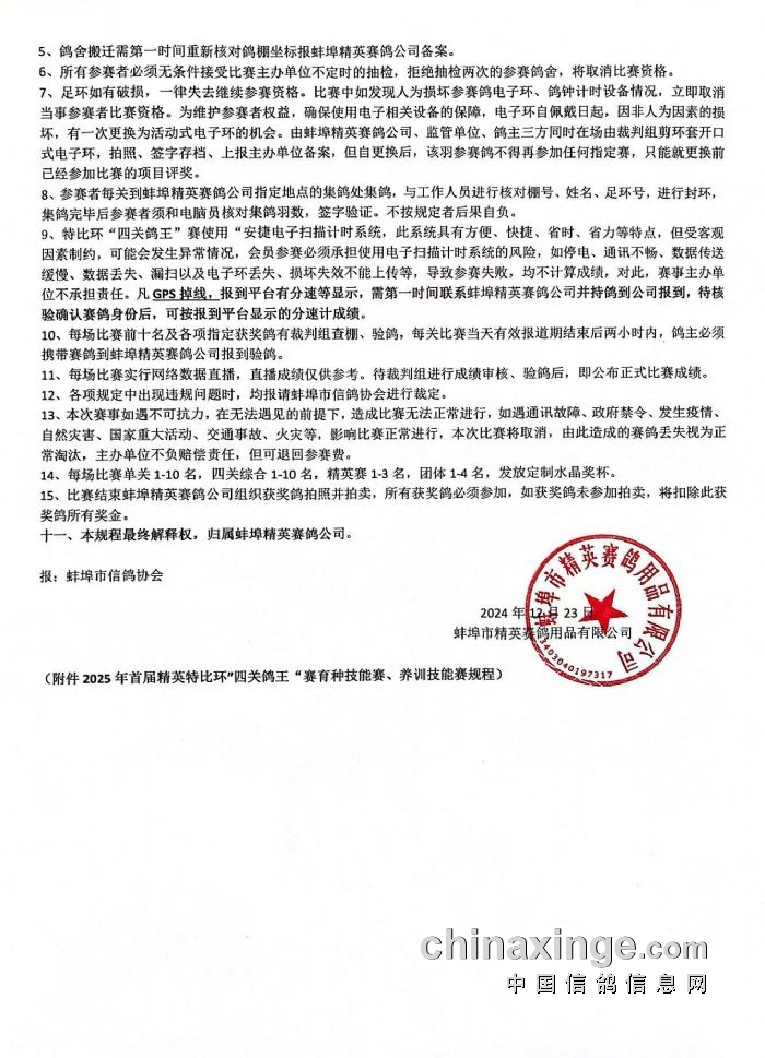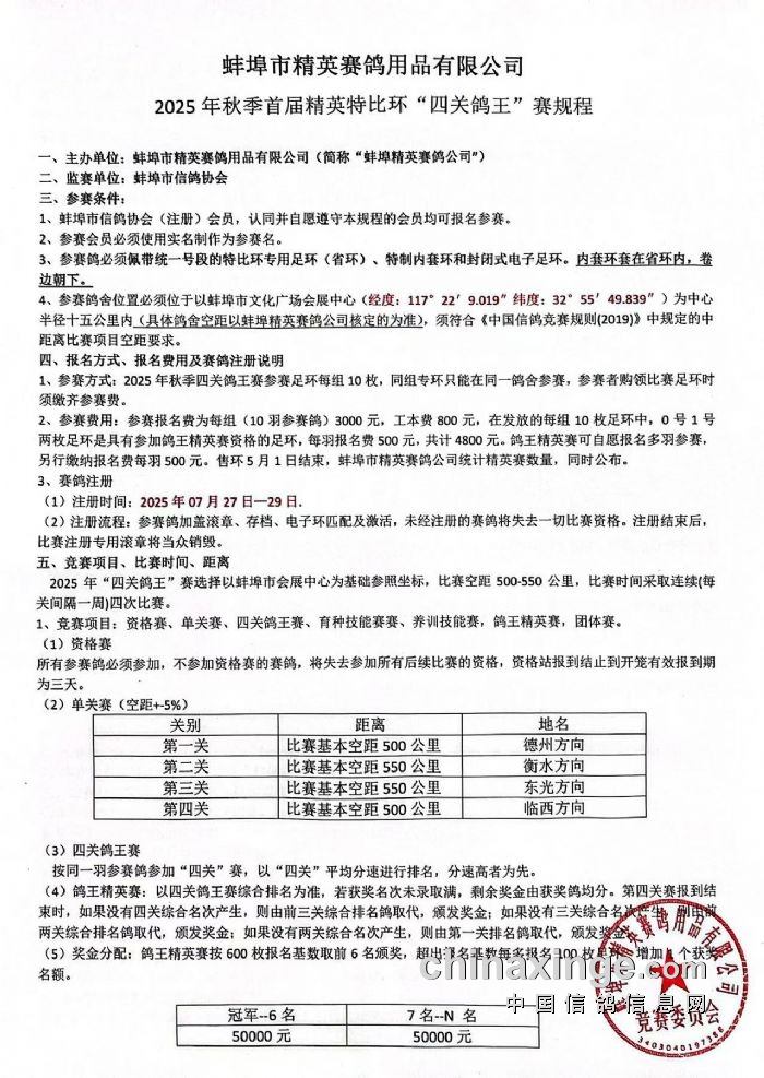 蚌埠市精英赛鸽用品有限公司2025年首届精英特比环“四关鸽王”赛规程