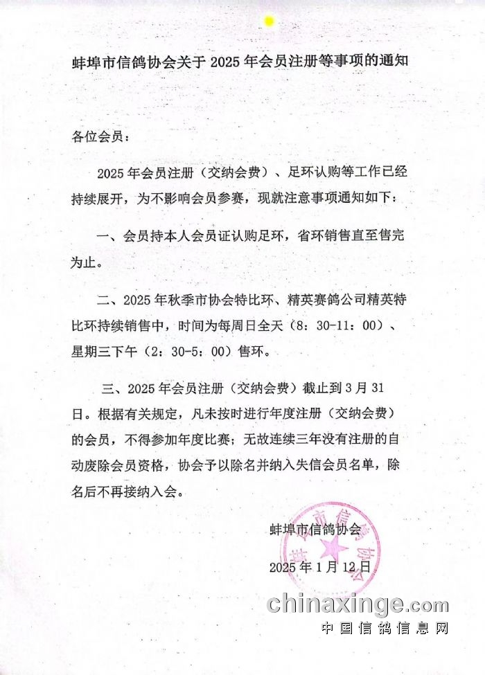 蚌埠市信鸽协会关于2025年度会员注册等事项的通知