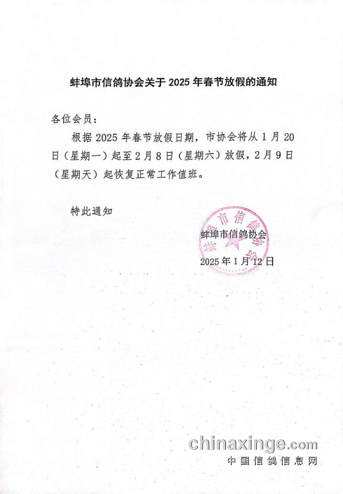 蚌埠市信鸽协会关于2025年春节放假的通知