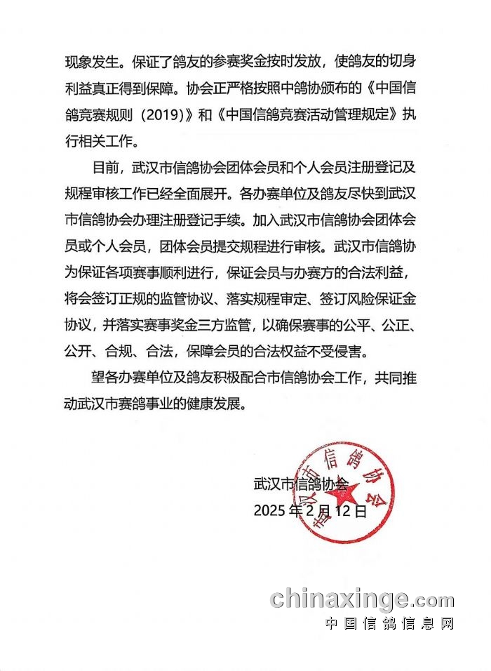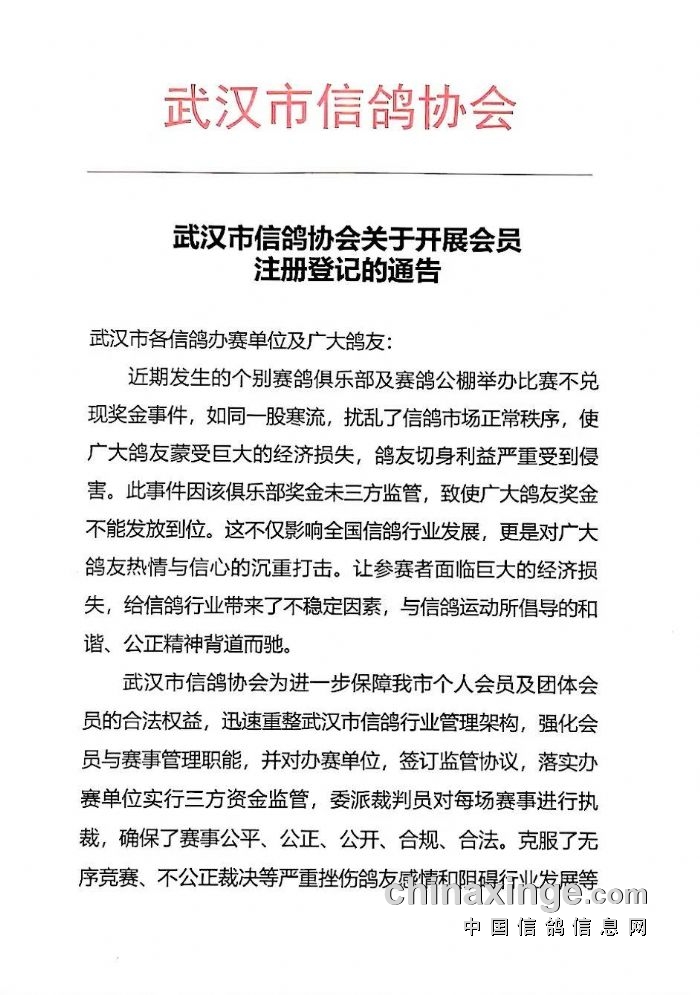 武汉市信鸽协会关于开展会员注册登记的通告
