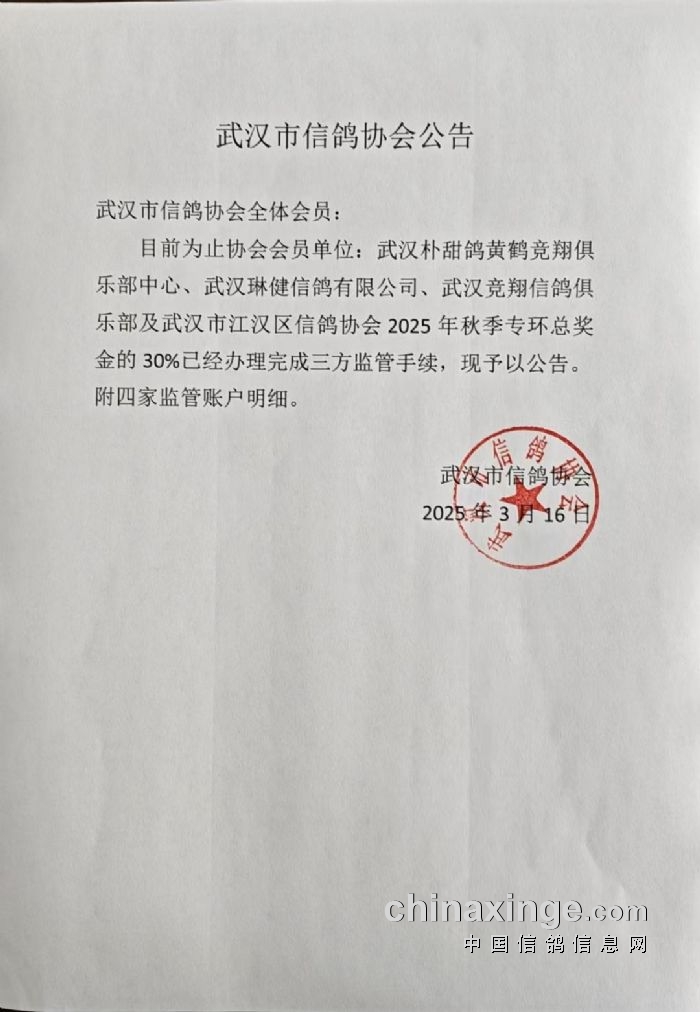 武汉博达凯义信鸽养殖有限公司2025年秋棚三方资金共管公告