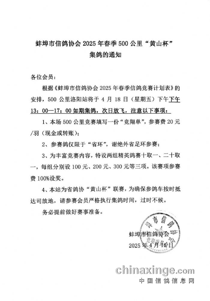 蚌埠市信鸽协会500公里“黄山杯”集鸽的通知