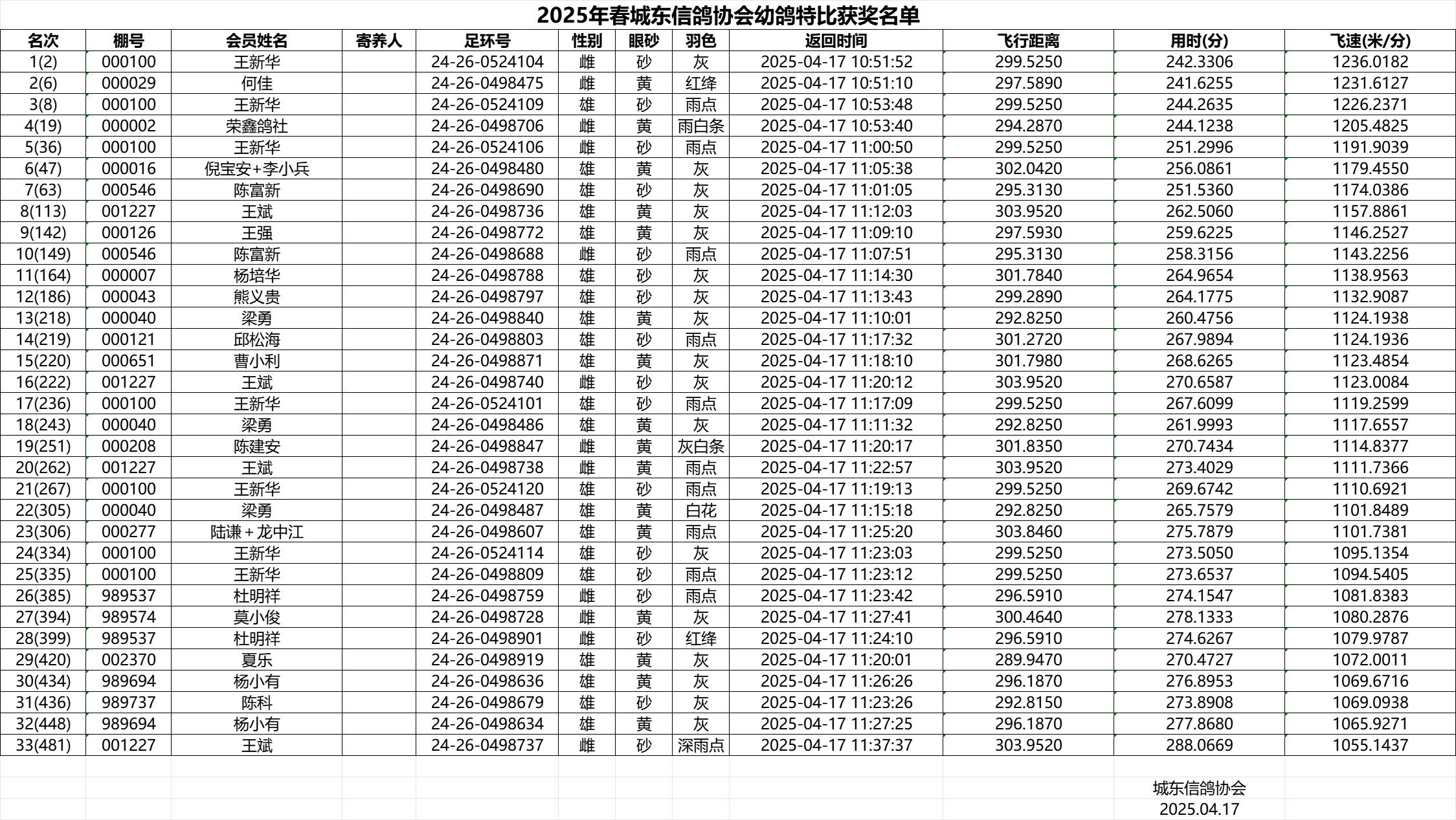 2025年春城东信鸽协会幼鸽特比获奖名单