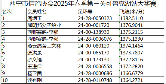 西宁市信鸽协会2025年春季第三关可鲁克湖站大奖赛前十位风采