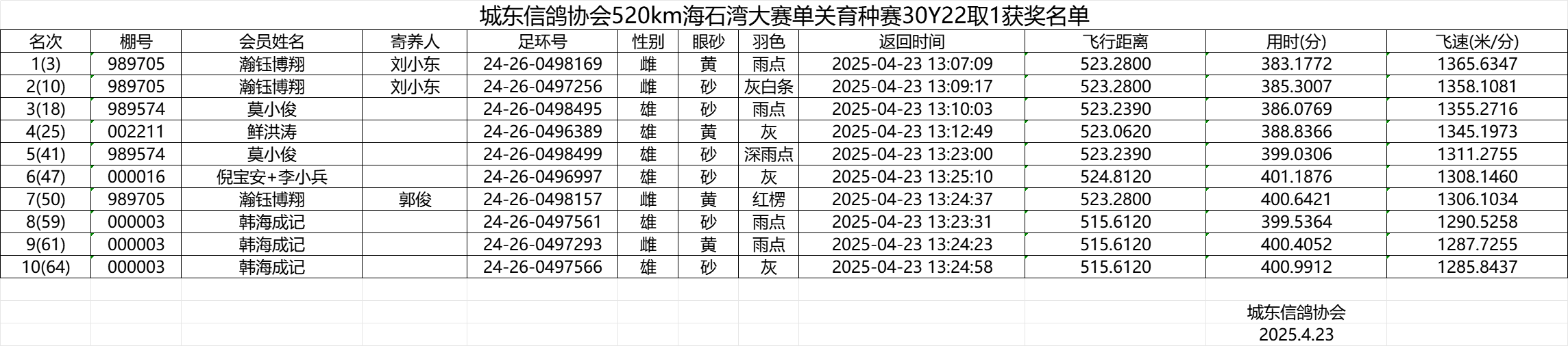 城东信鸽协会520km海石湾大赛单关育种赛30Y22取1获奖名单
