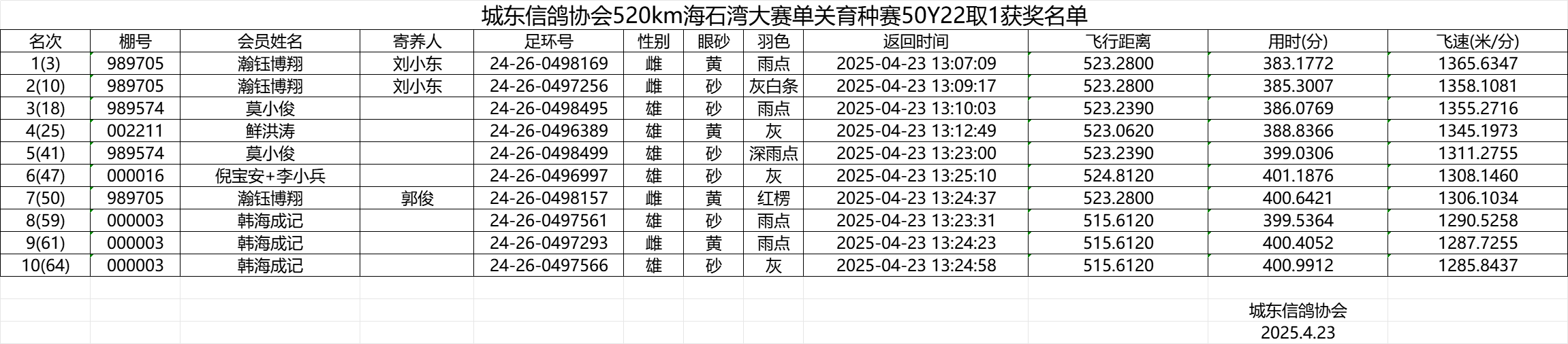 城东信鸽协会520km海石湾大赛单关育种赛50Y22取1获奖名单