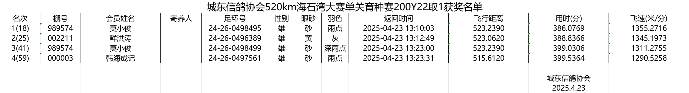 城东信鸽协会520km海石湾大赛单关育种赛200Y22取1获奖名单