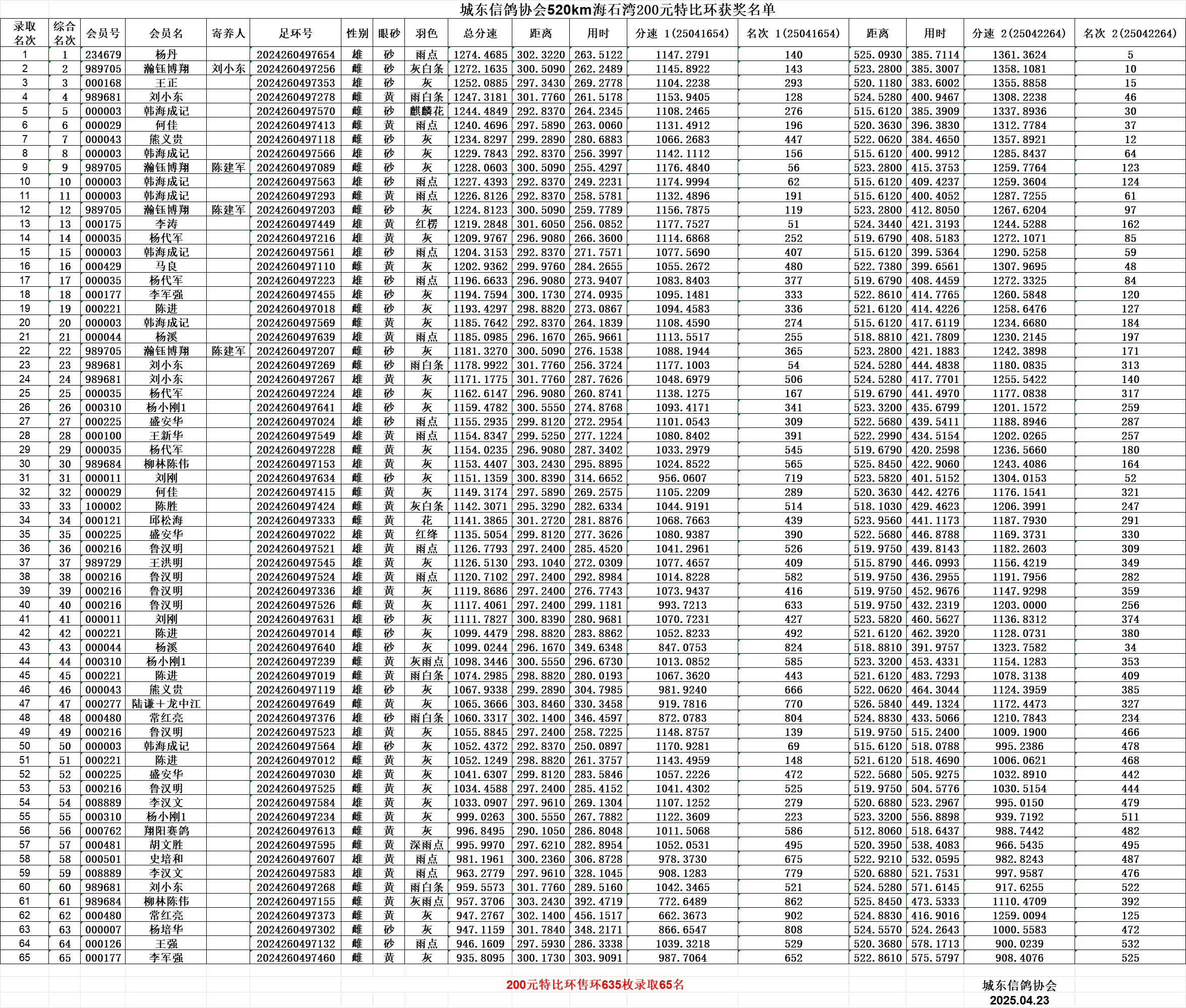 城东信鸽协会520km海石湾200元特比环获奖名单