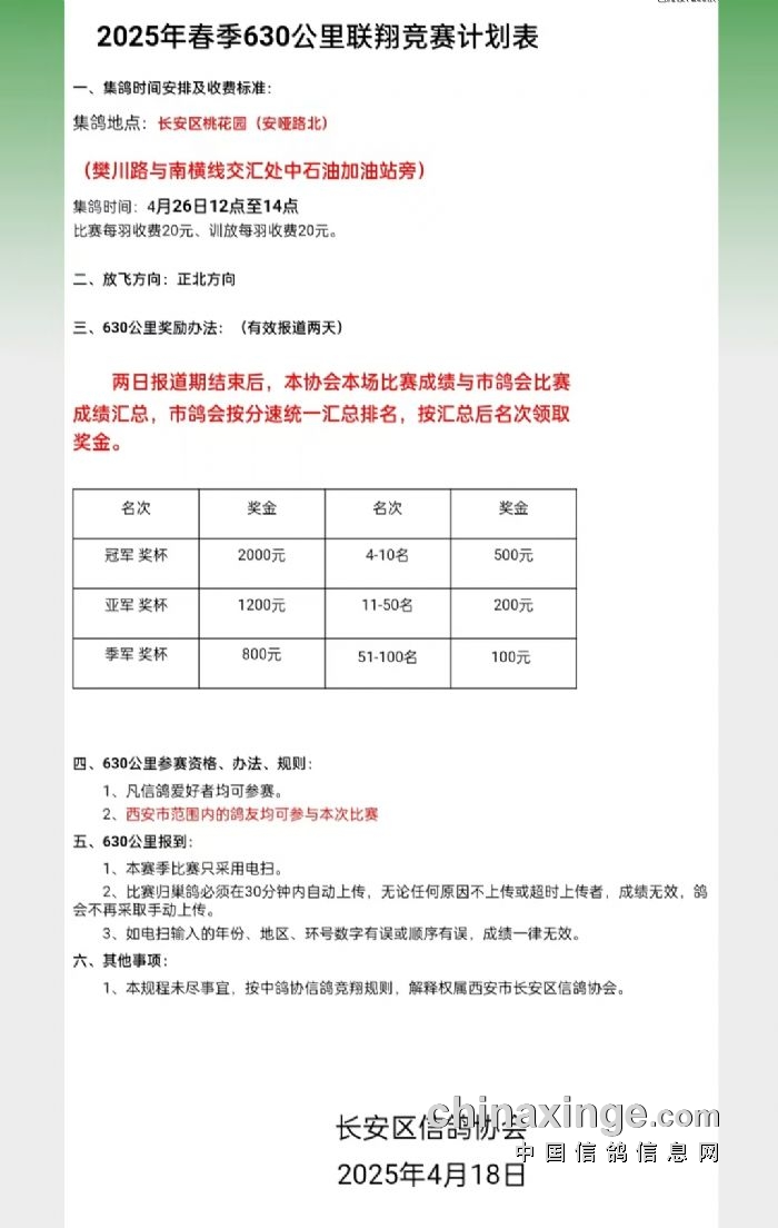 为了活跃西安市信鸽体育赛事活动,西安市信鸽协会参加陕西省信鸽协会举办2025年陕西省“全民健身会员杯”信鸽竞翔赛630公里级别的比赛,西安市辖区内的信鸽爱好者自愿参加(符合参赛距离600km),使用奥尼普特鸽钟的鸽友集鸽、报到均在新城区爱民路40号,使用科汇鸽钟的集鸽、报到均在长安区信鸽协会。集鸽时间详见下图: