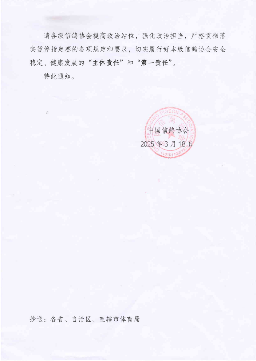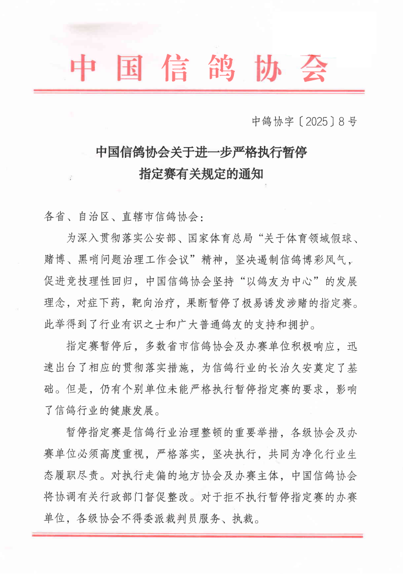 转发《中国信鸽协会关于进一步严格执行暂停指定赛有关规定的通知》