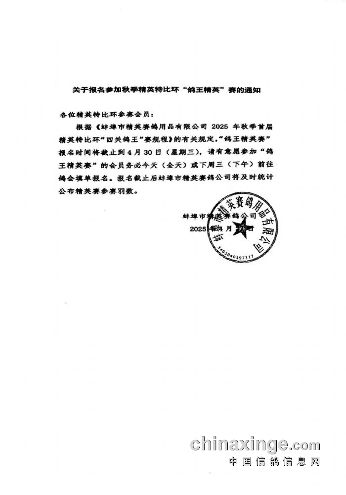 关于报名参加秋季精英特比环“鸽王精英赛“的通知