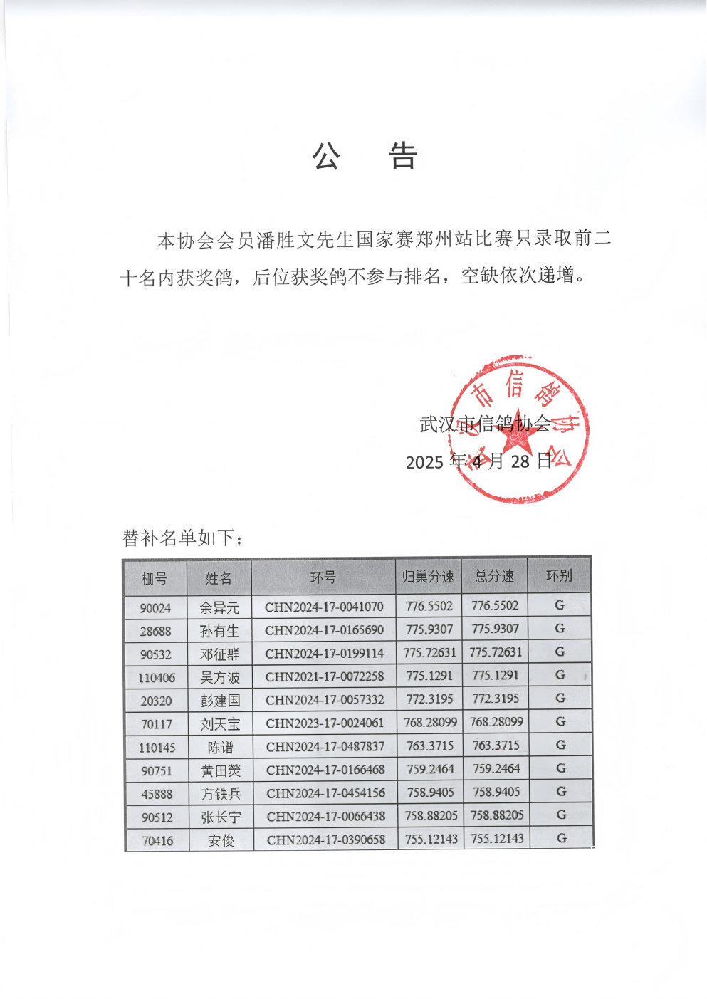 武汉市信鸽协会公告