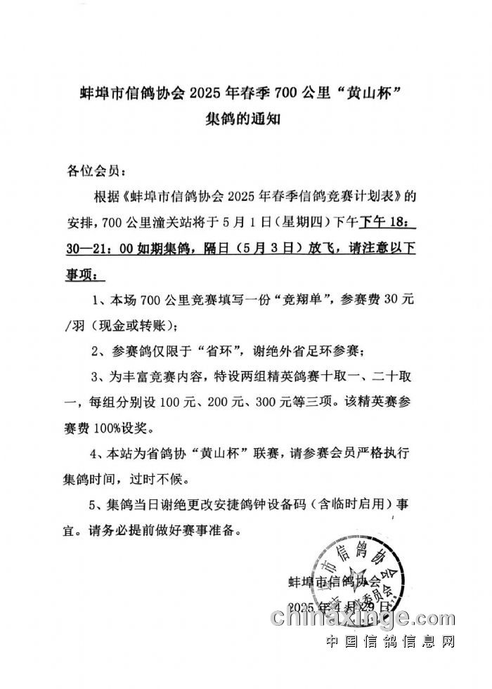 蚌埠市信鸽协会2025年春季700公里潼关站集鸽的通知