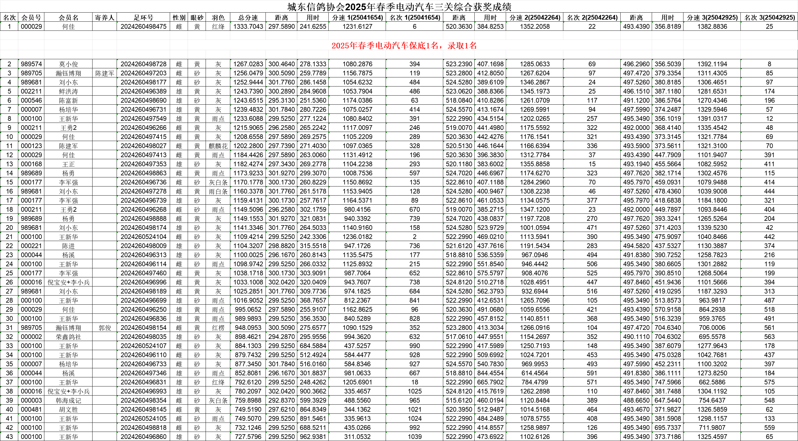 城东信鸽协会2025年春季电动汽车三关综合获奖成绩