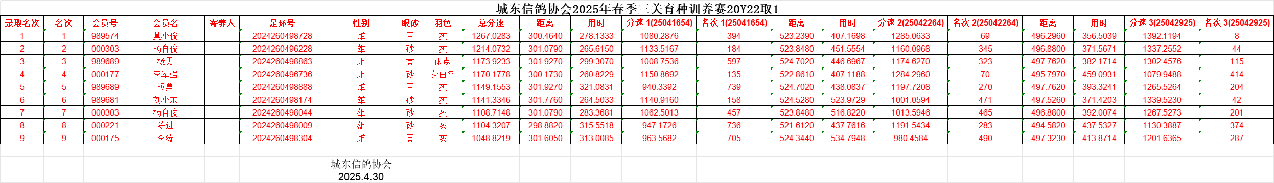 城东信鸽协会2025年春季三关育种训养赛20Y22取1