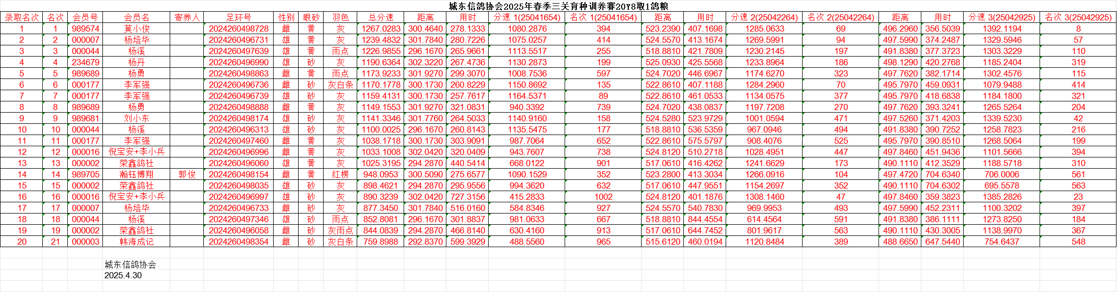 城东信鸽协会2025年春季三关育种训养赛100Y11取1(更正)