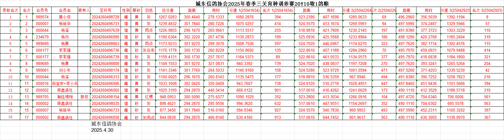 城东信鸽协会2025年春季三关育种训养赛100Y11取1(更正)