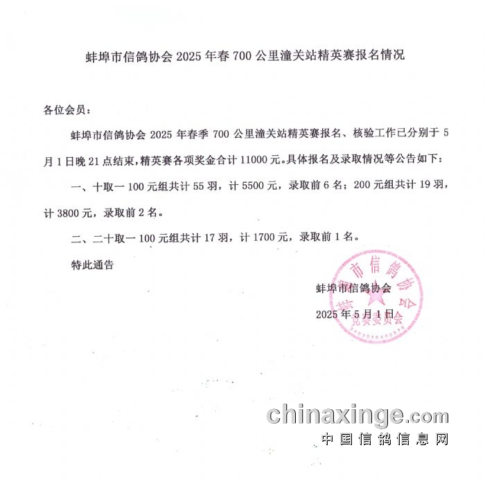 蚌埠市信鸽协会700公里潼关站精英赛报名情况说明