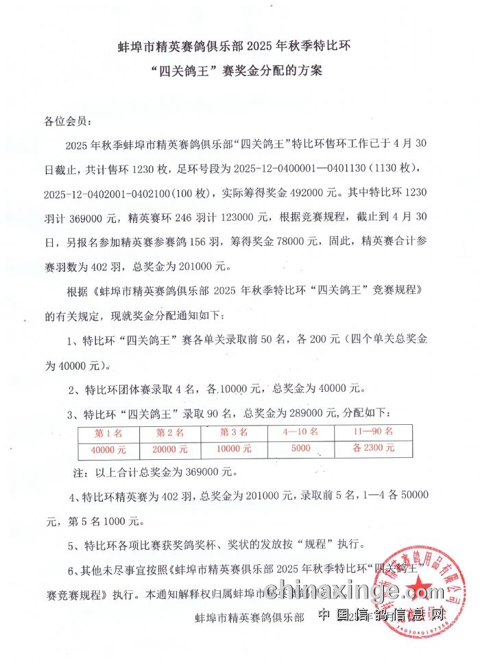 蚌埠市精英赛鸽公司2025年秋季特比环“四关鸽王”赛奖金分配方案