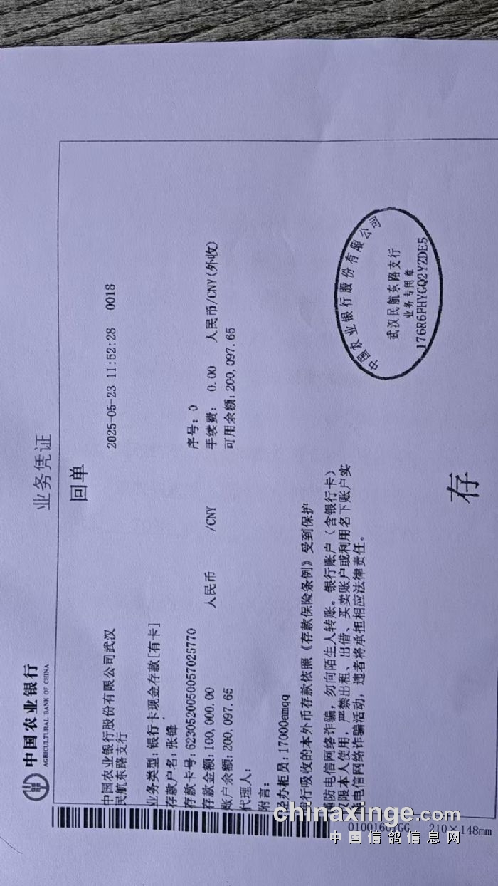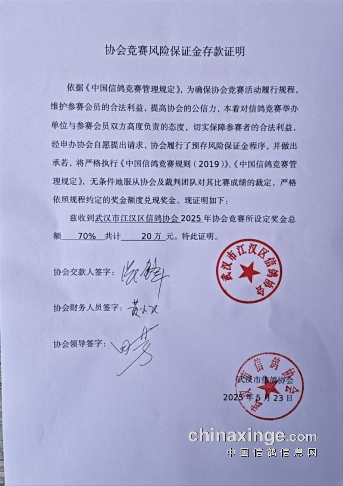 武汉市江汉区信鸽协会25年竞赛奖金存款证明