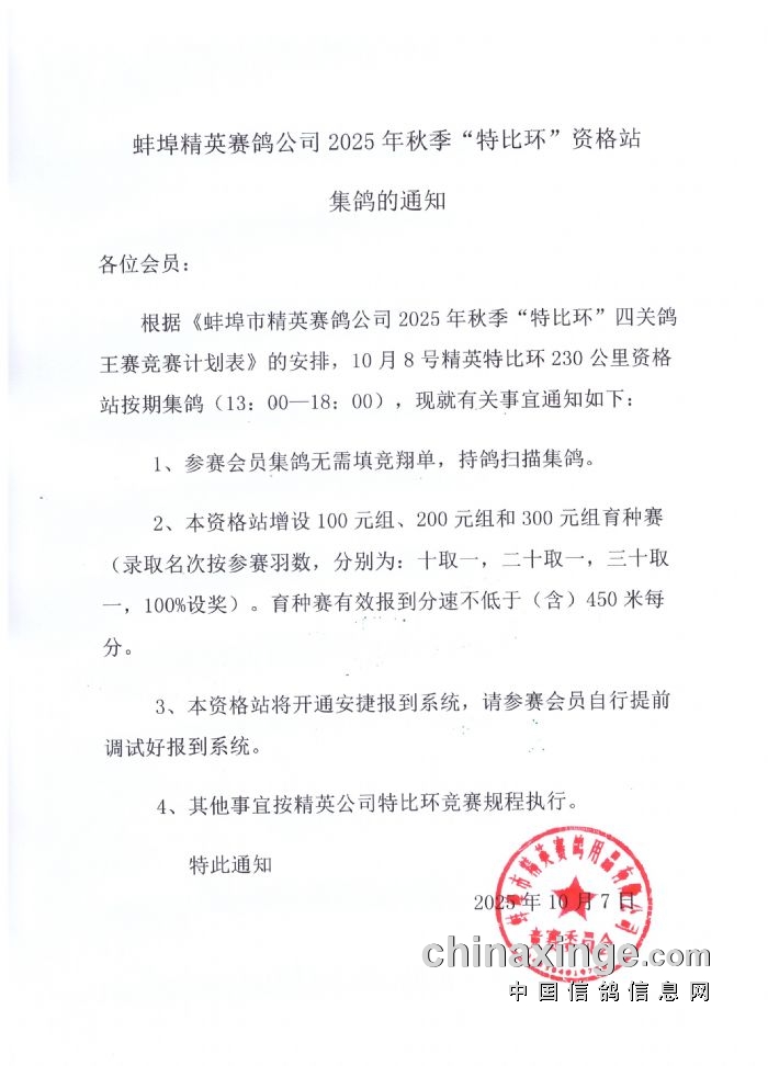 蚌埠精英赛鸽公司“特比环”资格站集鸽的通知