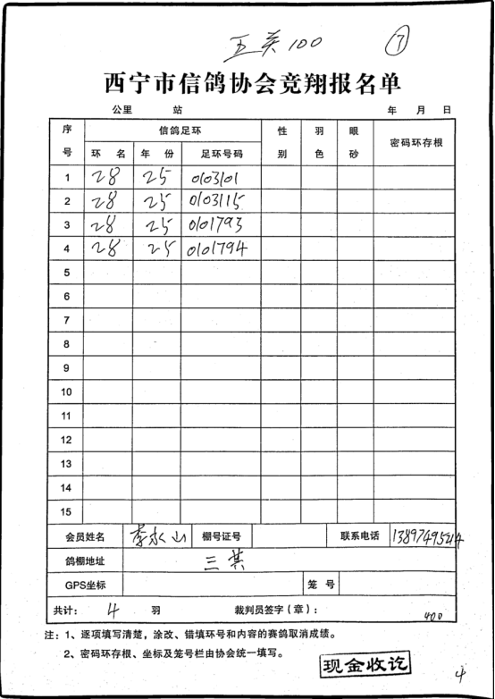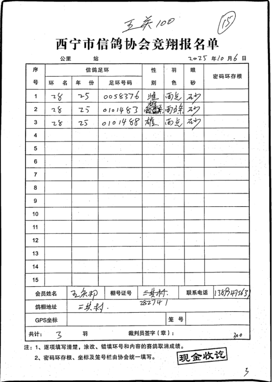 西宁市信鸽协会2025年秋季特比环四关综合赛三次交费小环名次表