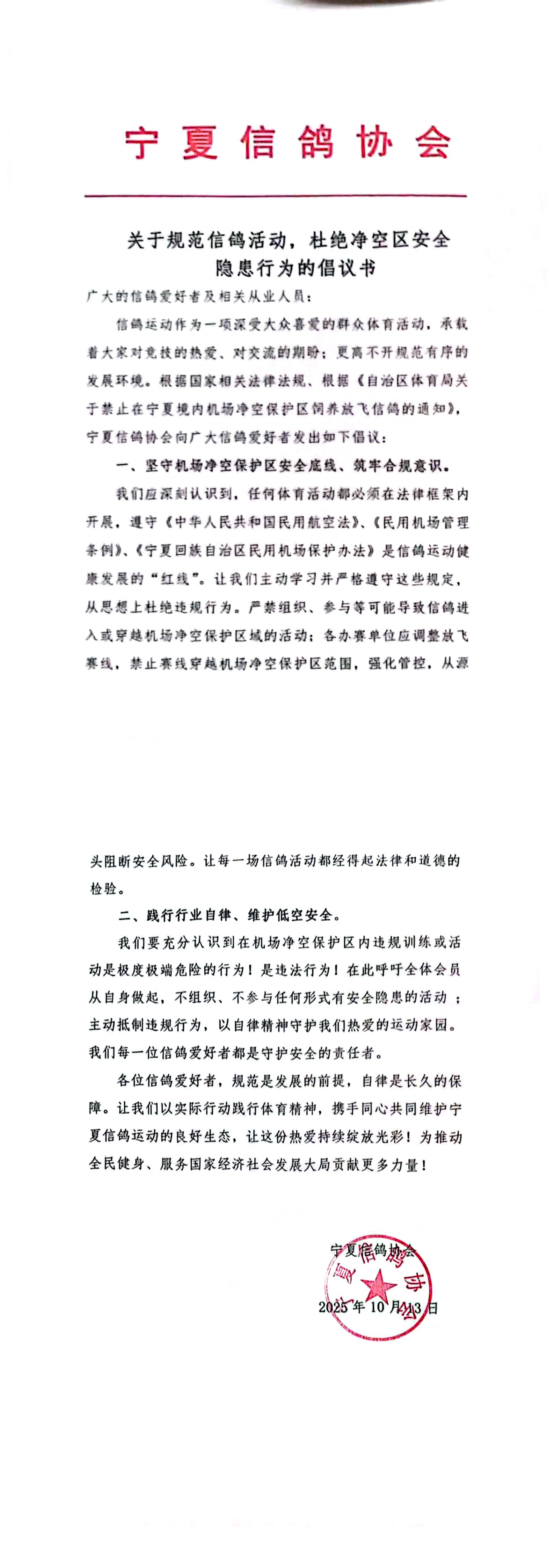 关于规范信鸽活动,杜绝净空区安全隐患行为的倡议书