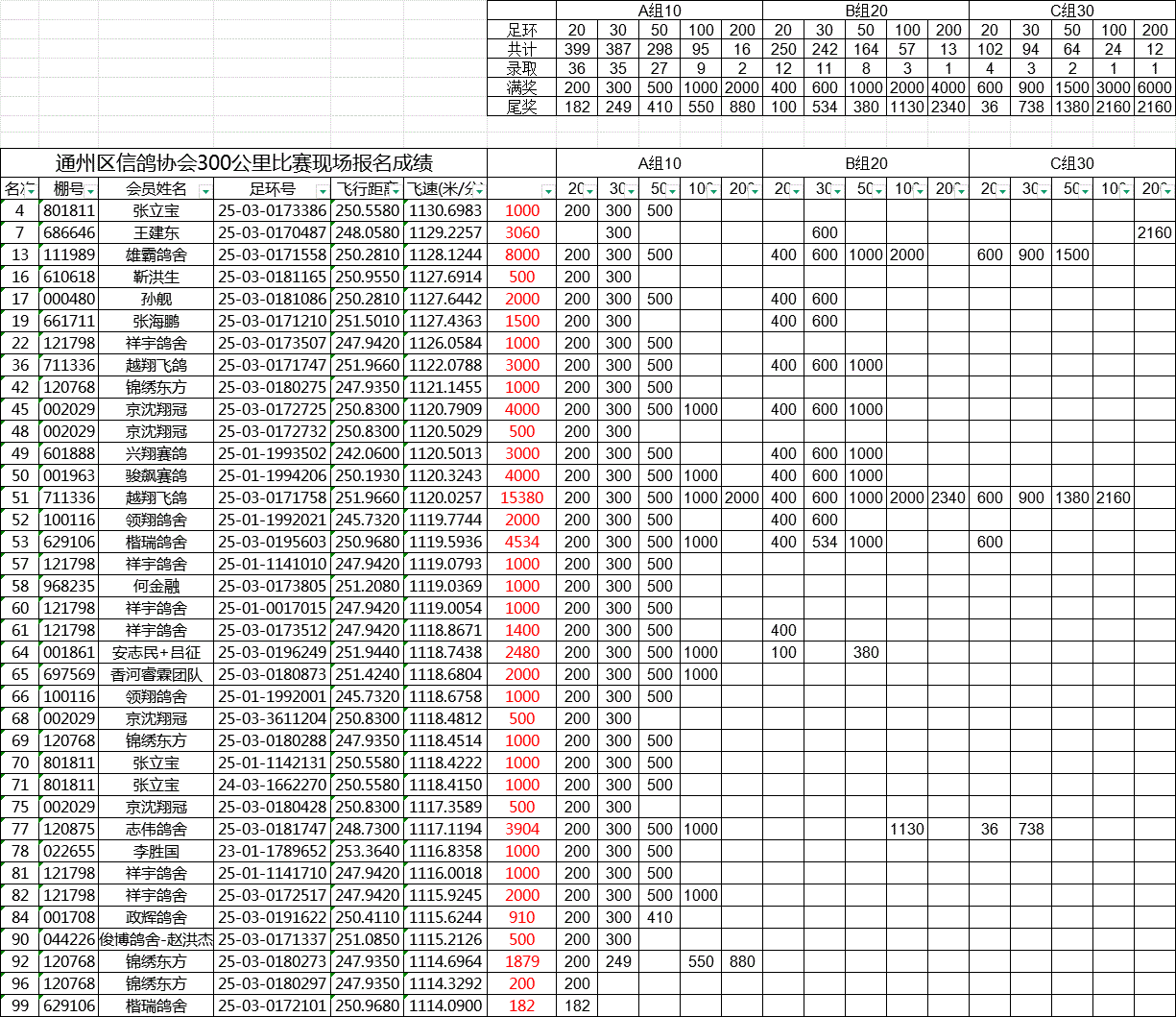 通州区信鸽协会2025年10月18日300公里比赛现场报名临时成绩