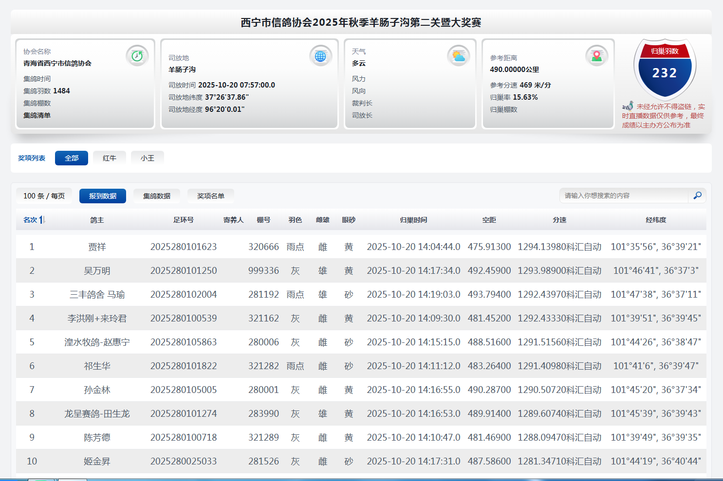 西宁市信鸽协会2025年秋季羊肠子沟特比环第二关暨大奖赛前十位风采