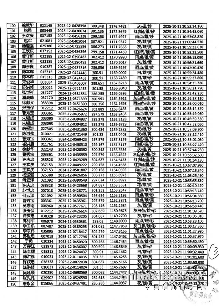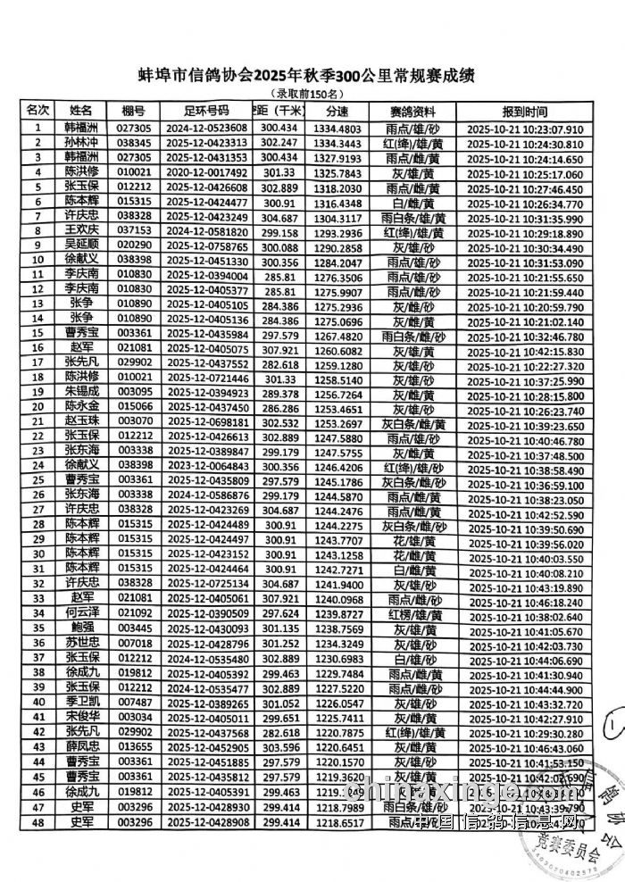 蚌埠市信鸽协会2025年秋季300公里常规赛成绩