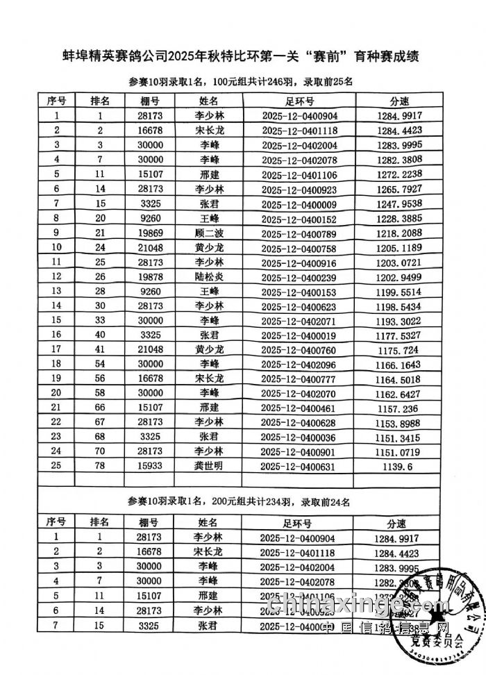 蚌埠市精英赛鸽公司2025年秋季特比环资格站“育种赛”成绩