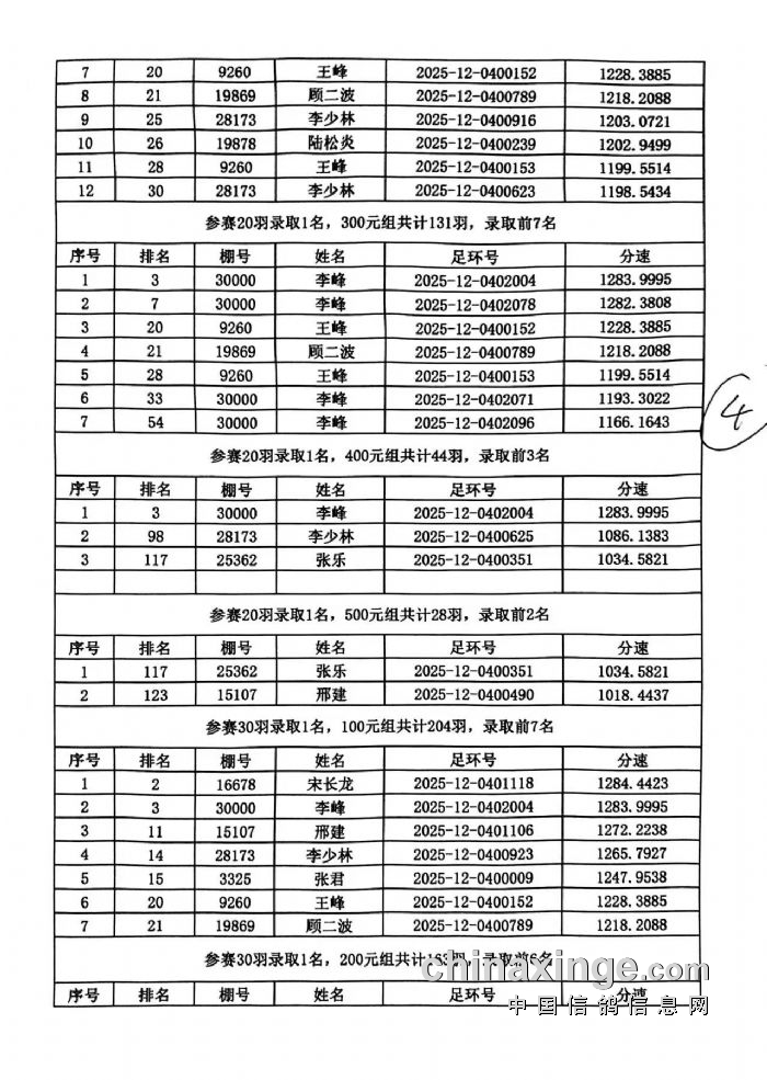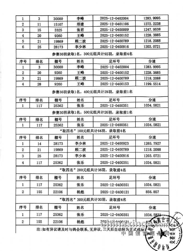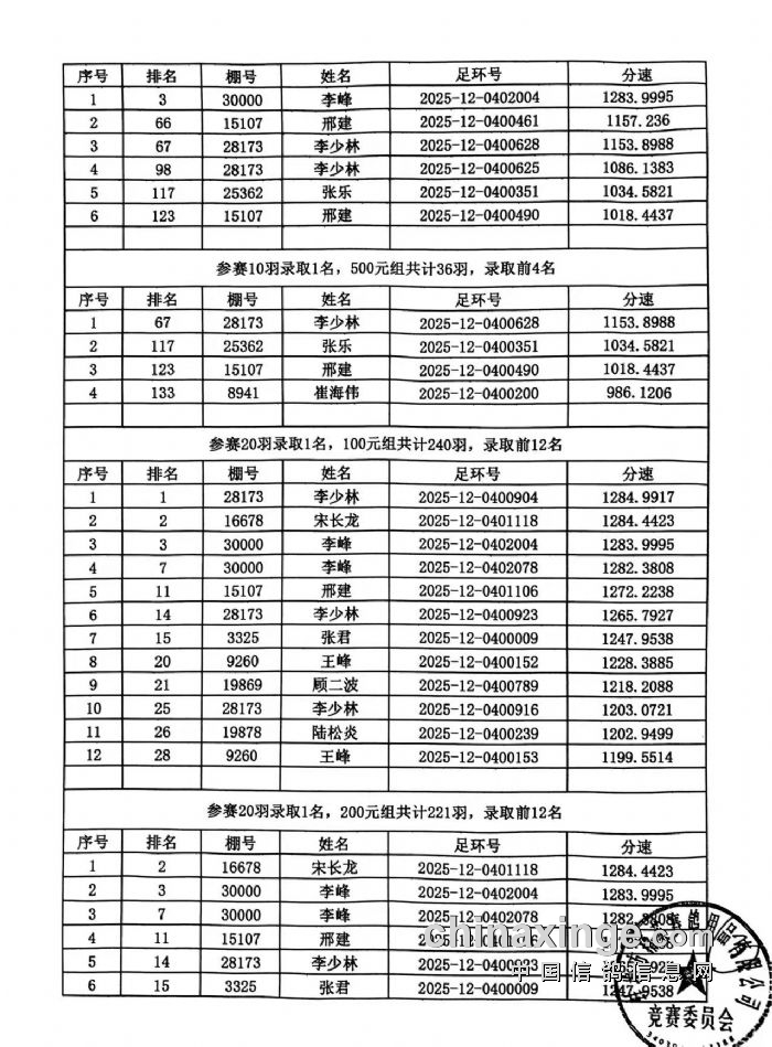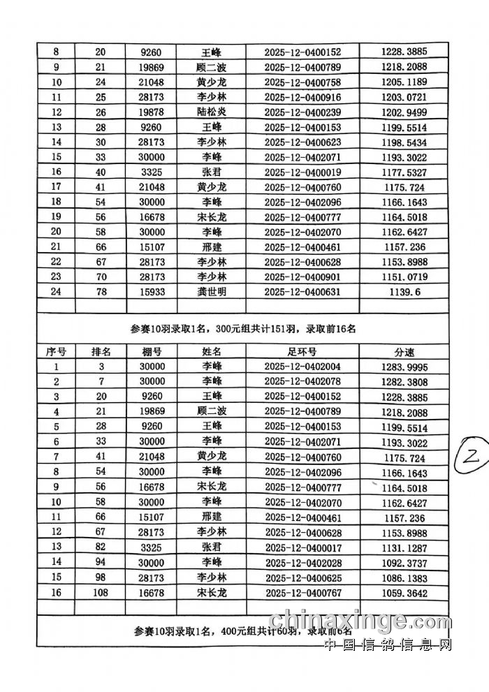 蚌埠市信鸽协会2025年秋季300公里常规赛成绩
