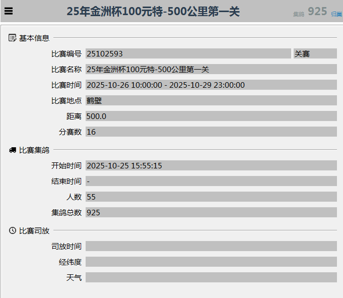 25年“金洲杯”100环一关集鸽数据