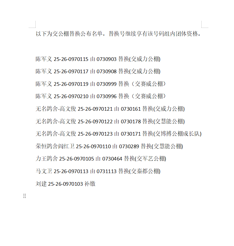 灞桥鸽会25年秋特比环交公棚足环替换名单