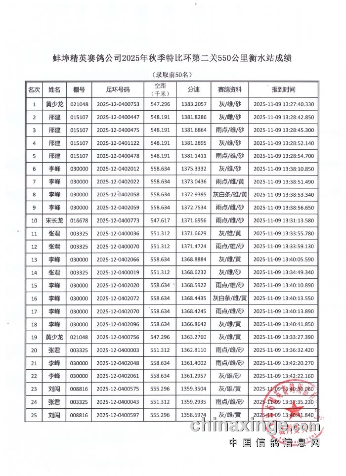 蚌埠精英赛鸽公司2025年秋季特比环550公里衡水站育种赛成绩