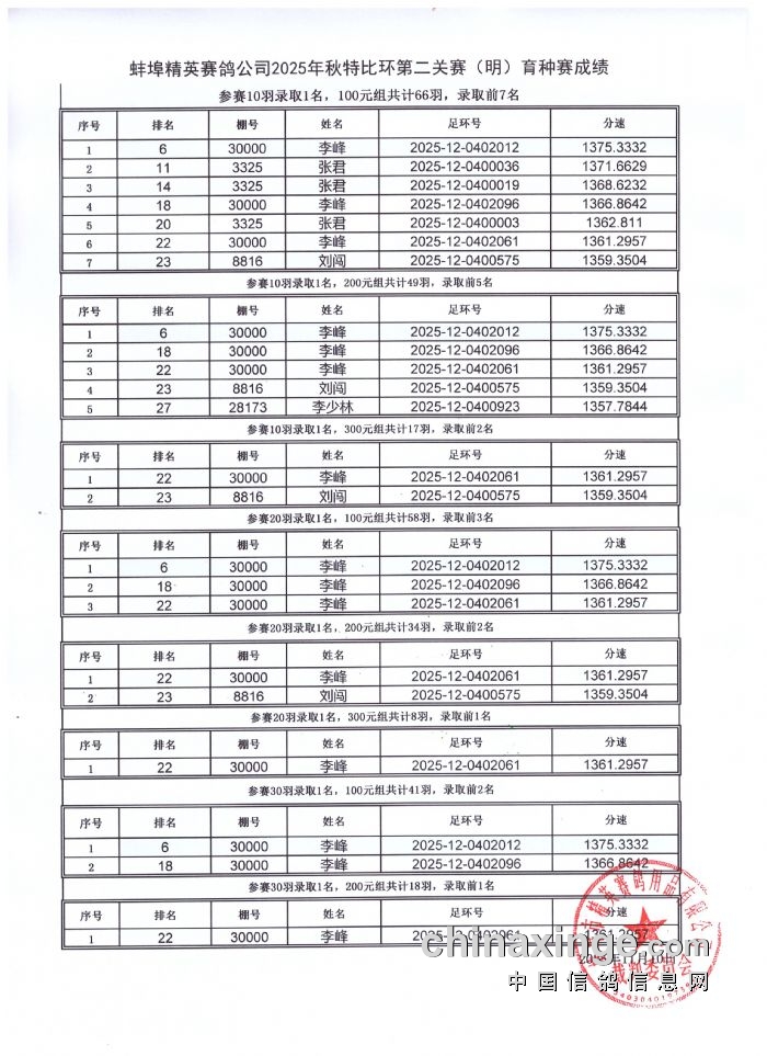 蚌埠精英赛鸽公司2025年秋季特比环第二关550公里育种赛报名情况说明