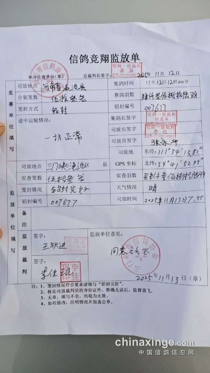 500公里已于早7点55分在河南省渑池县开笼,参考空距501公里。望相互转告!