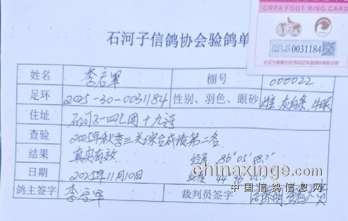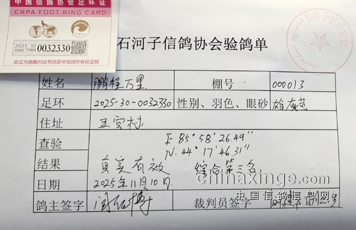 石河子信鸽协会2025秋季三关综合前三名