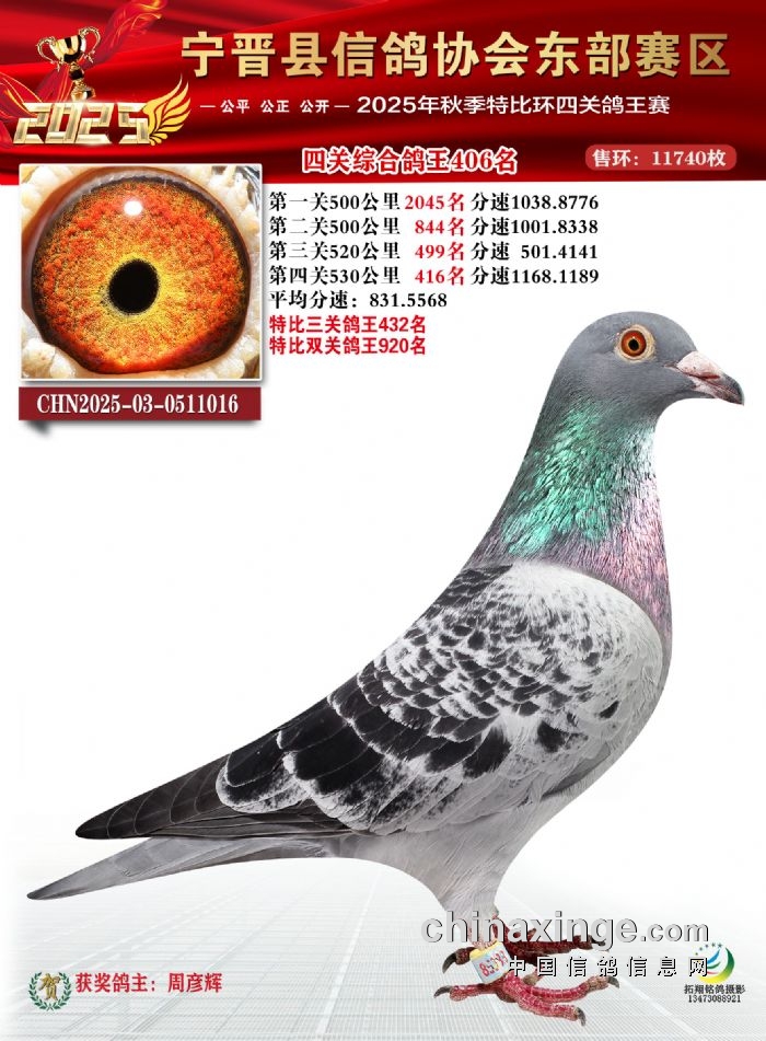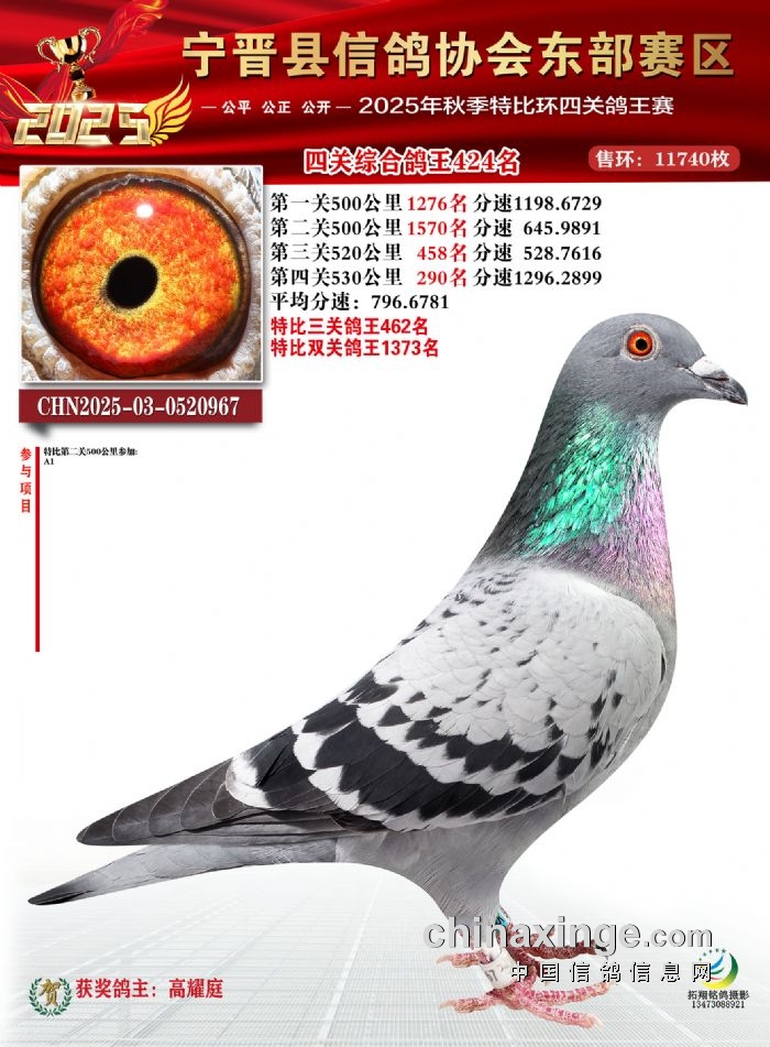 宁晋县东部赛区(黄儿营)25年秋季特比环四关综合优胜鸽301-400名