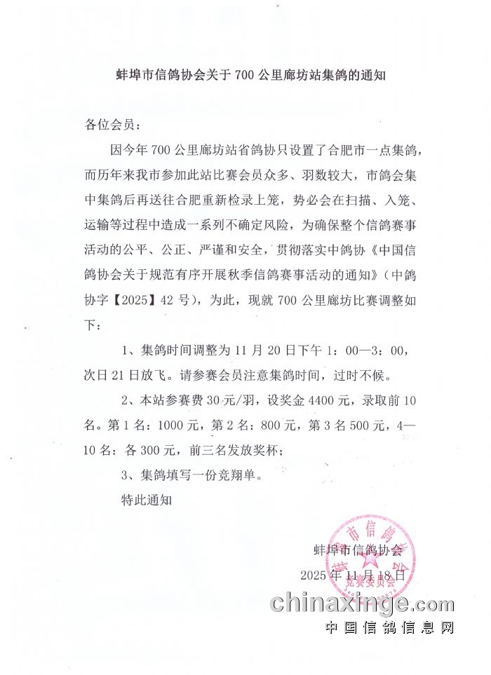 蚌埠市信鸽协会关于700公里廊坊站集鸽的通知