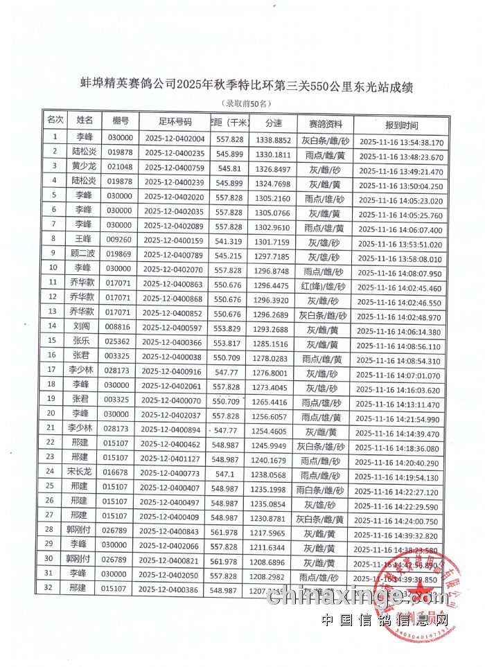 蚌埠精英赛鸽公司2025年秋季特比环前三关综合育种赛成绩