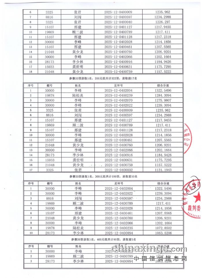 蚌埠精英赛鸽公司2025年秋季特比环前三关综合育种赛成绩