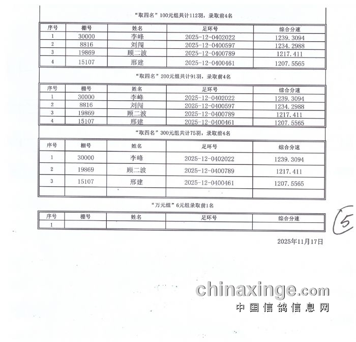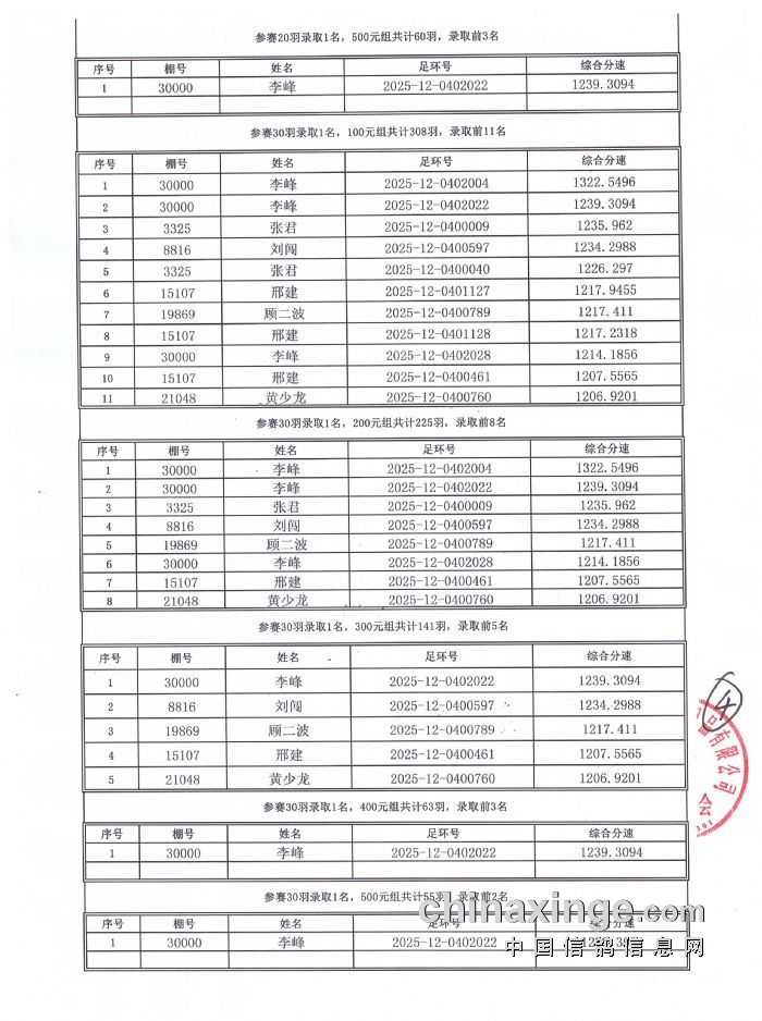 蚌埠精英赛鸽公司2025年秋季特比环第四关500公里临西站成绩