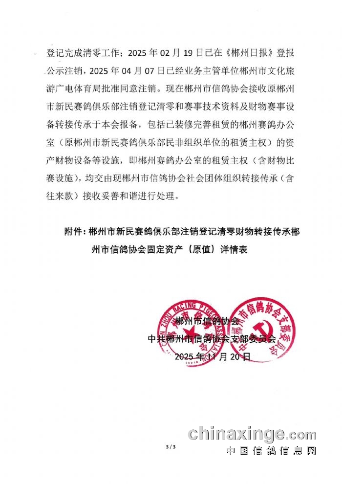 郴州市信鸽协会接收原郴州市新民赛鸽俱乐部注销登记清零其赛事技术资料及财物赛事设备转接传承报备