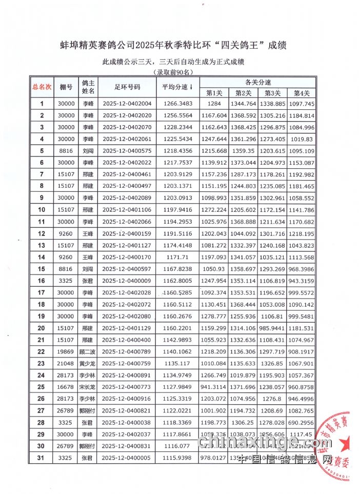 蚌埠精英赛鸽公司2025年秋季特比环“四关鸽王”成绩