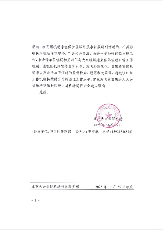 关于健全大兴国际机场信鸽治理日常工作机制的通知