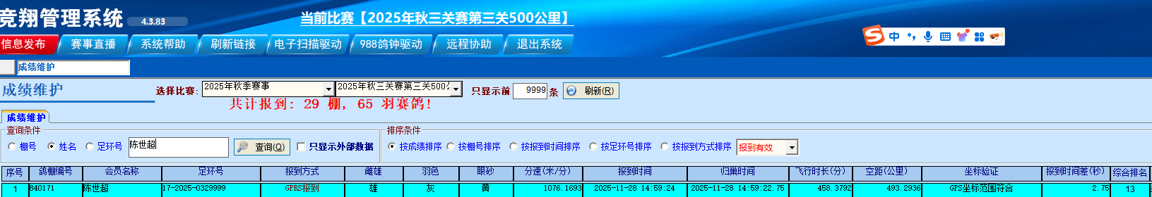 会员840171号因赛鸽足环错误(17-2025-0329999)我协会未发售此号段足环,经验鸽实际足环为17-2025-0319999,按照规程,足环错误直接取消所有成绩,后续名次补上,特此通知!